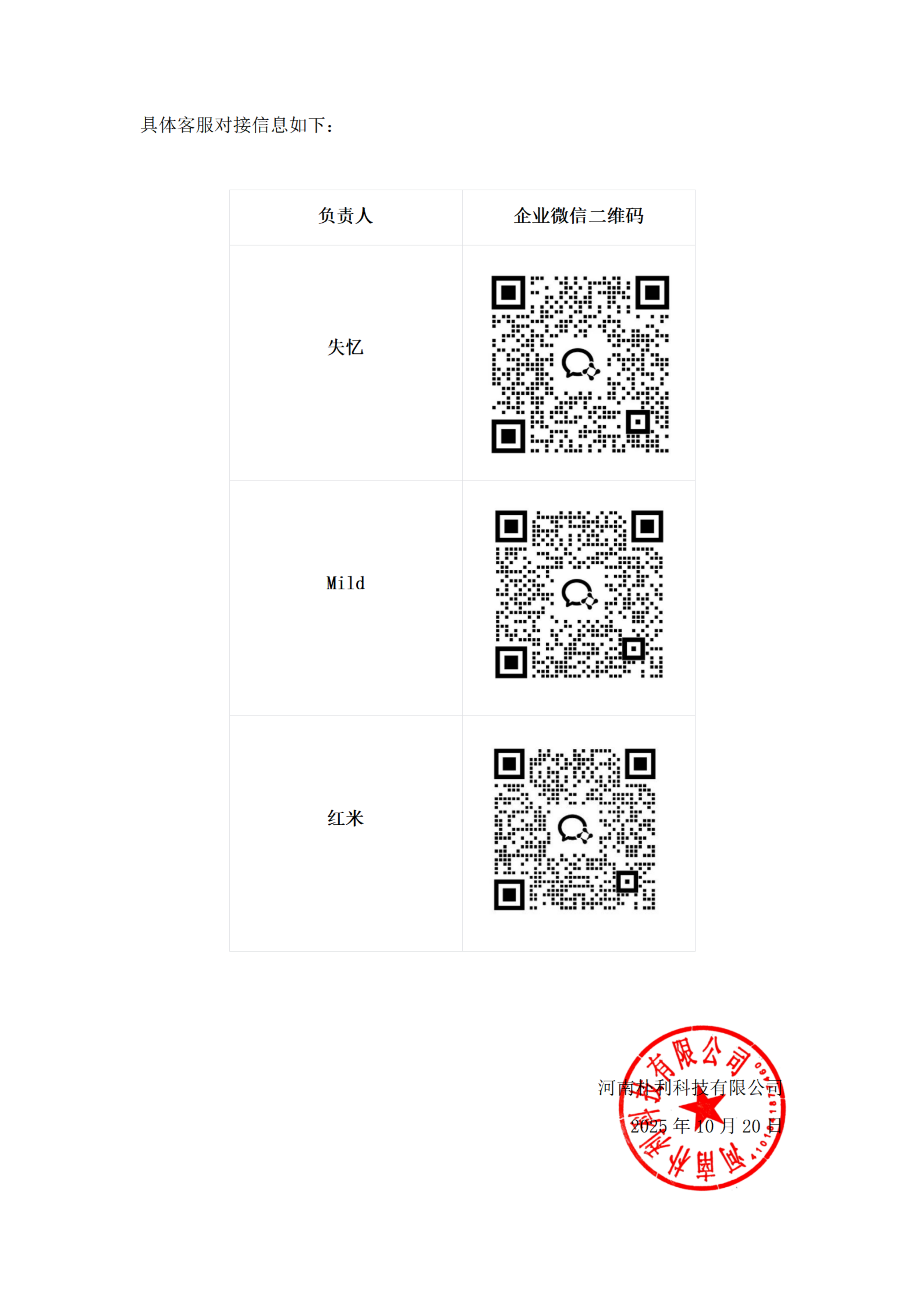 特别重要通知:原有的所有客服联系方式(包括但不限于客服电话、传统微信客服、邮箱等),自本通知发布之日起7个工作日后,将正式停止处理任何业务相关事宜。为避免影响您的业务正常开展,烦请各位客户在此期间及时完成企业微信客服的对接工作,我们将为您开通专属一对一交流群,群内将配备技术顾问、客户经理等专业人员,全程为您解答本次业务升级的具体内容、操作流程、注意事项等问题,同时处理日常的业务咨询、故障申报、需求提报等各类事宜,保障您的业务平稳过渡。